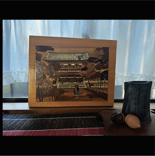 世界中に古くから伝わる伝統工芸である木象嵌により表現された「寺の山門」は、凜とした空気感が感じられる厳かな作品となっております。