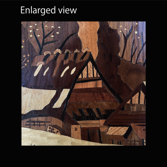 世界中に古くから伝わる伝統工芸である木象嵌により表現された「里の雪解け」は残雪の残る藁葺き屋根の家々を里山をバックに木の象嵌で表現しています。